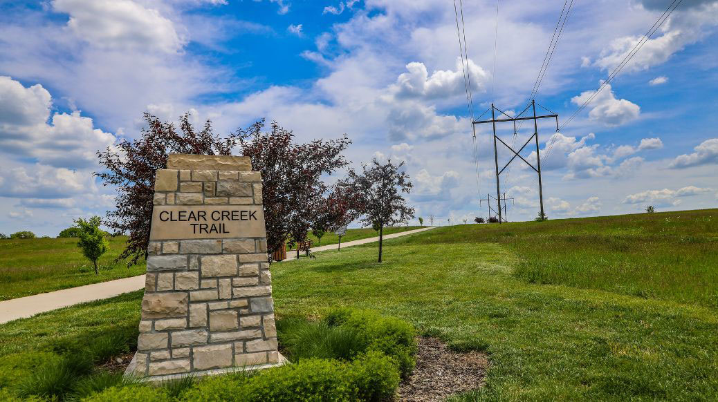 Clear Creek Trail stone monument sign in foreground with trail and power line in background